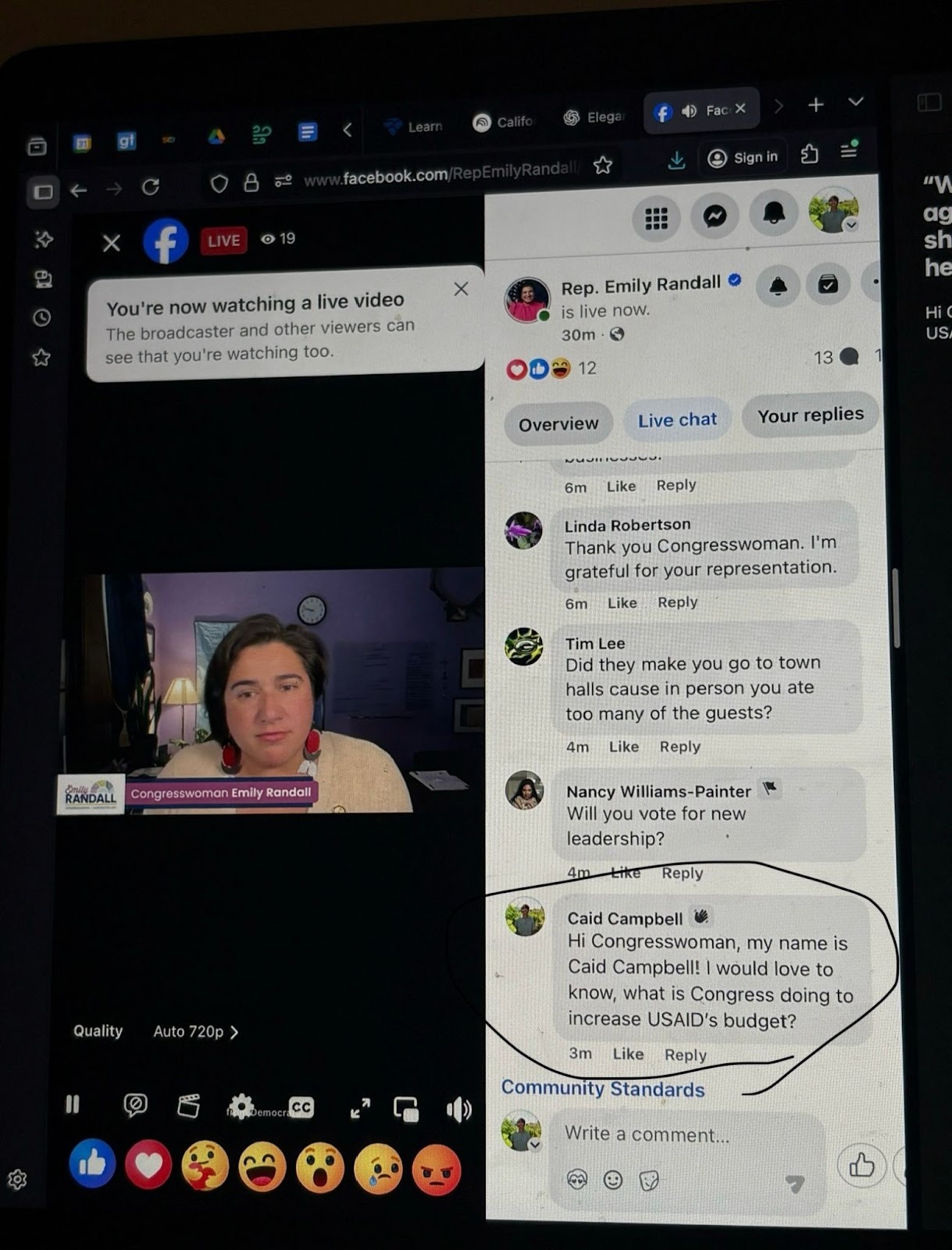 Political Affairs Team member, Caid Campbell bird-dogged Representative Emily Randall (D-WA-6) via Facebook live
